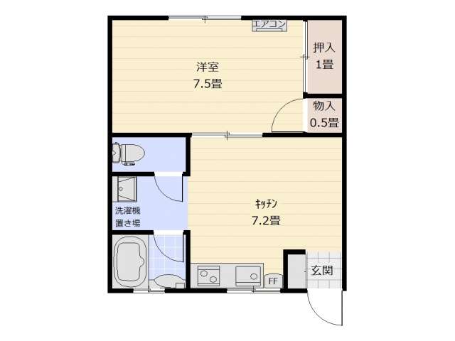| 詳細間取 | 1DK (洋7.5帖×1、DK7.2帖) | ||